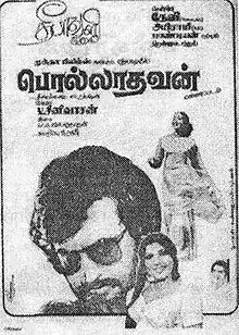 Rajinikanth initially wanted to star in a Tamil remake of the Hindi film Vishwanath (1978), with S. Ravi producing. Ravi watched the film, but did not like it; Rajinikanth and Ravi then decided to remake a different film. K. Balaji gave Ravi a video cassette of the Kannada film Premada Kanike (1976), and told him to tell Rajinikanth to watch it. Rajinikanth told Ravi he had already watched the film multiple times and liked it, so it was decided to remake the film in Tamil as Polladhavan.[4] The film was directed by Ravi's father Muktha Srinivasan (who also wrote the screenplay) and produced by Ravi under Vidhya Movies.[3] The film was made in CinemaScope.[5] Cinematography was handled by M. Karnan,[4] and editing by V. P. Krishna.[3] Srinivasan cast Delhi Ganesh after seeing his performance in the play Thuppariyum Saambu.[6] Shooting for the film took place primarily at Bangalore,[7] with additional shooting taking place in Chennai, Shimla and Kashmir.[4] The eyes shown in the beginning of the film belonged to a poet Ilangai Vijayendran.[8]