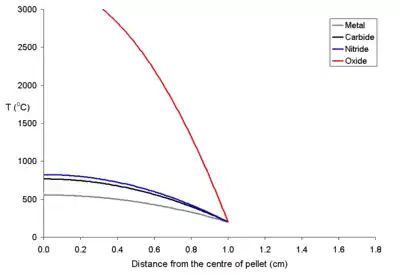 ![]() Temperature profile for a 20 mm diameter fuel pellet with a power density of 1000 W per cubic meter. The fuels other than uranium dioxide are not compromised. |
