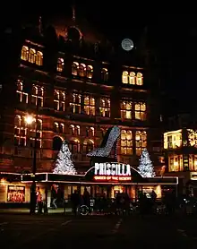 A West End production started previews on 10 March 2009 at the Palace Theatre with the opening press night on 23 March. It is co-produced by Andrew Lloyd Webber's Really Useful Group and directed by Simon Phillips with musical arrangements by Stephen 'Spud' Murphy, choreography by Ross Coleman, costume designs by Tim Chappel and Lizzy Gardiner, production designs by Brian Thomson, and lighting by Nick Schlieper.[4] The original cast included Jason Donovan as Mitzi (aka "Tick"), Tony Sheldon as Bernadette, and Oliver Thornton as Adam/Felicia.[4][5] Notable replacements include Ben Richards as Tick/Mitzi, Don Gallagher as Bernadette, Portia Emare as one of the Divas and Ray Meagher as Bob. The West End production closed on 31 December 2011.[6] An immersive version of the show, Priscilla The Party!, also directed by Simon Phillips is scheduled to open in March 2024 at HERE @ Outernet in London.[7]