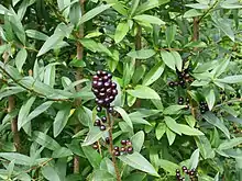 Some species produce a fruit, which is mildly toxic to humans.[8][13] Symptoms from eating privet fruit include nausea, headache, abdominal pain, vomiting, diarrhea, weakness, low blood pressure, and low body temperature.[8] At least some privet species are known to be toxic to horses.[14]