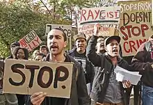 On October 29, 2013, around 100 students and community members gathered outside of List Arts Center at Brown University with signs chants, including "No Justice, No Peace. No Ray(cist) Police."[2]