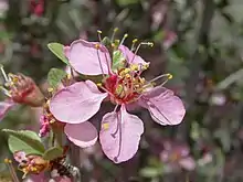 Prunus andersonii is a shrub approaching 2 meters (80 inches) in height, its tangling branches narrowing to spiny-tipped twigs. Serrated, lance-shaped to oval leaves occur in clusters, each leaf measuring up to 3 centimeters (1+1⁄4 in) long. The shrub is deciduous. The inflorescence is a solitary flower or pair of flowers. Each flower has usually five concave pink petals each just under 1 cm (3⁄8 in) long, with many whiskerlike stamens at the center. Flowers bloom before or at the same time as the leaves appear.[6] The fruit is a fuzzy reddish-orange drupe around 1 cm (3⁄8 in) wide. The fruits are fleshy in years with ample moisture, and dry in drought years.[6] The seed is a heart-shaped stone.[6] The plant reproduces sexually via germination of the seed, and vegetatively by sprouting from its rhizome.[6] One plant may sprout and resprout from its rhizomes to form a very large clone which can spread over several acres.[6][7]