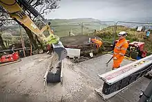 The additional works included the establishment of a temporary pumping system and strengthening to a 300 m (980 ft) long section of tunnel which had previously been designated as an exclusion zone.[30] By the end of September, around 80% of the floodwater – estimated at 3,700,000 L; 980,000 US gal (820,000 imp gal) – had been removed; however, over the following week, the southern half of the tunnel was again inundated due to a prolonged period of heavy rain. In response, AMCO-Giffen demobilised most of their equipment from the tunnel and the preparatory works were suspended.[31]