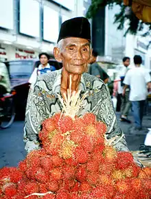 As of 2014, Thailand was the largest producer of rambutans (Thai: เงาะ, RTGS: ngo),[18] growing 450,000 tonnes, followed by Indonesia at 100,000 tonnes, and Malaysia, 60,000 tonnes.[18] In Thailand, major cultivation centers are Chanthaburi Province, followed by Chumphon Province and Surat Thani Province.[18] In Indonesia, the production center of rambutan is in the western parts of Indonesia, which includes Java, Sumatra, and Kalimantan.[19] In Java, the orchards and pekarangan (habitation yards) in the villages of Greater Jakarta and West Java have been known as rambutan production centers since colonial era, with a trading center in Pasar Minggu, South Jakarta.