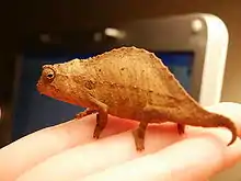 Rieppeleon brevicaudatus, commonly known as the bearded leaf chameleon or bearded pygmy chameleon,[1] is a chameleon originating from the eastern Usambara and Uluguru Mountains in northeastern Tanzania and Kenya. It is easily distinguished from others in the Rieppeleon genus by the presence of a "beard" below the mouth, consisting of a few raised scales. At a full grown length of only 3 in (8 cm), it is marked by somewhat drab coloring in comparison to other chameleons, usually assuming a brown or tan coloring. It is quite capable of changing its coloration, though, often taking on a shade to blend into the background and becoming darker when under stress. It is also capable of compressing its body laterally and producing a stripe down its side, mimicking a dead leaf. It often assumes this form when sleeping in the open. It can adopt a variety of colors, including yellow, green, orange, black, and brown. A common misconception is that these chameleons use their color-changing abilities as camouflage, but they actually use their color-changing skin to court and show stress or emotion. Males are distinguished by a longer tail, more prominent dorsal crest, slimmer body type, and persistent patterning. Like others in the family Chamaeleonidae, it is distinguished by independently rotating eye sockets and a tongue longer than its body.