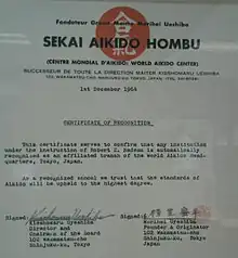 At the end of his study in Japan Nadeau was issued a rare certificate of recognition as an authorized Aikido teacher signed by Morihei Ueshiba and Kisshomaru Ueshiba.