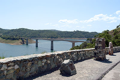 Robinson's Ferry is a historical site in Angels Camp, California in Calaveras County. John W. Robinson and Stephen Mead founded a ferry in 1848. The ferry crossed the river, where New Melones Lake is now. The New Melones Lake Bridge now crosses where the ferry was. The ferry was used to move California Gold Rush miners, their cargo and animals across the river. Harvey Wood purchased the ferry in 1856. The fare to cross was 50 cents for each person or animal crossing. The site of Robinson's Ferry a California Historical Landmark No. 276. [1] A marker is on California State Route 49 near the bridge across New Melones Lake. The historical marker was placed there in 1949 by California Centennial Commission, and the base was built Angels Camp Lions Club. The Marker is 5.6 miles south of Angels Camp and 0.3 miles north of New Melones Lake Reservoir.[2] [3]