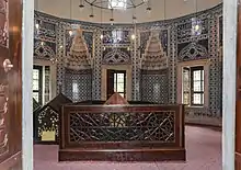 Hürrem died on 15 April 1558 due to an unknown illness and was buried in a domed mausoleum (türbe) decorated in exquisite Iznik tiles depicting the garden of paradise, perhaps in homage to her smiling and joyful nature.[41] Her mausoleum is adjacent to Suleiman's, a separate and more somber domed structure, at the courtyard of the Süleymaniye Mosque.