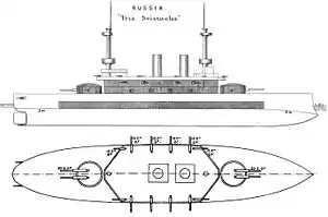 Tri Sviatitelia was named after the Three Holy Hierarchs of the Eastern Orthodox Church. She was built by Nikolayev Dockyard and laid down 15 August 1891, although actual construction had begun about January 1891. The ship was launched 12 November 1893 and transferred to Sevastopol for completion the following year. Officially she entered service in 1895 with the Black Sea Fleet, but her sea trials did not begin until September–October 1896.[16] In 1899 Tri Sviatitelia became the first ship in the world to be fitted with a radio, an installation designed by the Russian physicist Alexander Stepanovich Popov that had a range of about 3 miles (4.8 km).[17] The ship was flagship of Rear Admiral F. F. Vishnevetskii during the failed attempt to recapture the mutinous battleship Potemkin on 30 June 1905.[18] Her forward fighting top was removed about 1908.[19]