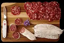 A traditional salami, with its typical marbled appearance, is made from beef or pork (sometimes specifically veal). Beef is usual in halal and kosher salami, which never include pork for religious reasons. Makers also use other meats, including venison[12] and poultry (mostly turkey).[13] Goose salami is traditional in parts of Northern Italy. Salami has also been made from horse meat.[14] In the Provence region of France and in the Veneto region of Italy donkey meat is used for salami, as well, the product being sold in street markets. Typical additional ingredients include:[15]