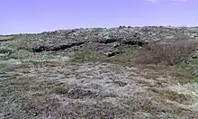 The lavas of Kapelluhraun ([ˈkʰaːpɛtlʏˌr̥œyːn], "chapel lava") from historical time (erupted around 1150)[12] have been given this name because of a medieval chapel whose ruins are still standing on them. A small statue of Saint Barbara was found at the place.[13] The Kapelluhraun lava field consists of pāhoehoe and ʻaʻā lava which streamed from the highland down to the bay of Straumsvík near today’s aluminium smelter and there into the sea.[12] The events were part of a ca. 30 years long unrest period in the late 12th century which is called Krýsuvík Fires. This unrest period included repeated eruption series and rifting episodes and is recorded in Flateyjarbók.[12]