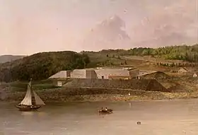 Eastman's work, which complements the work of Hudson River School landscape painters of his era, illustrates how images of the landscape supported and extended the United States' work of empire building. That is, the images of Americans' possession and domination of the landscape supported their mission of empire. Eastman's images recorded the empire's reach into the northwest and helped spur it on. In this regard, Eastman was working on a similar mission to the landscape painters who were working from private commissions.[8] Near the end of his career, at the rank of lieutenant colonel, Eastman was commissioned by the House Committee on Military Affairs to paint pictures of seventeen important forts. He completed these paintings between 1870 and 1875. One controversial painting was Death Whoop, which was twice removed from display because of negative comments from viewers, as it portrayed an Indian's scalping a white man. In the 1930s the paintings were displayed again in the US Capitol Building.