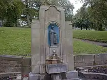 The natural warm waters of Buxton have been revered since Roman times. By the 1520s the spring was dedicated to St Anne and the curative powers of the waters from the well were reported. A 16th-century act of parliament ruled that a free supply of the spring water must be provided for the town's residents. The current stone water fountain with its brass lion's head spout was built in 1940, replacing its predecessors from 1895, 1783 and earlier. St Ann's well is next to the Pump Room, built in 1894 to dispense the well water for drinking (the building is now the Tourist Information centre). The geothermal spring rises from about 1km below ground and about a million litres of water flow out per day. The mineral water emerges at a steady 27°C. Analysis of the water has indicated that it has a high magnesium content and that it originated around 5,000 years ago. The same spring water is bottled and sold as Buxton Mineral Water.[4][5][6][7]