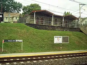 Sharon Hill station is a SEPTA Regional Rail station in Sharon Hill, Pennsylvania. It serves the Wilmington/Newark Line, with southbound service to Wilmington and Newark, Delaware and northbound service to Philadelphia. This station is about 1⁄2-mile (0.80 km) away from the Sharon Hill terminus of the SEPTA Route 102 trolley, although no direct connection exists between the two stations. It is not a staffed station and has no ticket machines. The historic station building, which was originally built in 1872,[4] is abandoned and is to be restored. It is located at Sharon & Woodland Avenues. Amtrak trains pass through but do not stop.