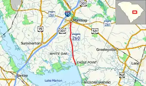 South Carolina Highway 260 (SC 260) is a 12.520-mile-long (20.149 km) state highway in the U.S. state of South Carolina. The highway connects the Santee Dam and Manning.