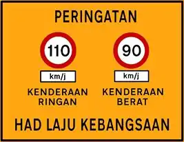 Had Laju Kebangsaan (National Speed Limits) is a set of speed limits applicable on Malaysian expressways, federal roads, state roads and municipal roads. The National Speed Limits was enforced on 1 February 1989 following the National Speed Limit Orders 1989 (Perintah Had Laju Kebangsaan 1989).[1] Like any other countries in the world, failing to obey the speed limit on Malaysian roads and expressways is an offence as subject to Malaysian Road Safety Act 1987, which can be fined up to RM300, depending on the difference between the speed limit and the driven speed.