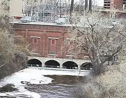 The original station burned down and a new one was built in 1911[9] that used only waterpower for three 480 kW generators. The Plant was the "main generating facility" for the city, so Minneapolis General Electric wanted the plant back in operation rapidly. That resulted in a plant that was significantly more primitive than the 1908 Hennepin Island Hydroelectric Plant built three years earlier. The turbines survived the fire and were reused. That required the new generators be powered by a "rope drive" (rope used as a drive belt), and the electrical production was far smaller than the Hennepin Island Plant.[17] The Station continued to produce electricity until 1968 Shown in the picture, the plant is very visible at 206 Main St. One side, with intake gates, is against the upper pond. A dam was built in 2000 to protect that side (it is now the access to a Water Power Park).[18][19] [20] [11] The visible part of the plant is above the limestone cap that forms the Falls. The east-side channel of the river (around Hennepin Island) used to flow through where the Plant is and over the east-channel Falls [9][21] about 300 ft. downstream from the Plant. The Plant was built between Hennepin Island and the east bank.