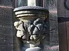 Clockwise from top left: detail of entrance and tower, east window, foliate capital, former school, church hall, and entrance carvings