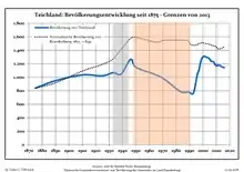 Development of Population since 1875 within the Current Boundaries (Blue Line: Population; Dotted Line: Comparison to Population Development of Brandenburg state; Grey Background: Time of Nazi rule; Red Background: Time of Communist rule)
