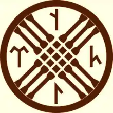 A symbol used by many Tengrists, representing the runic spelling of god Tengri and "shangrak" (an equilateral cross in a circle), depicting the roof opening of a yurt, and a shaman's drum.