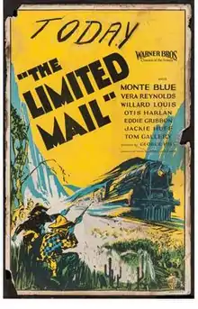 The Limited Mail is a 1925 American silent drama film directed by George Hill and written by Charles Logue and Darryl F. Zanuck. The film stars Monte Blue, Vera Reynolds, Willard Louis, Tom Gallery, Jack Huff, and Eddie Gribbon. The film was released by Warner Bros. on September 5, 1925.[1][2][3]