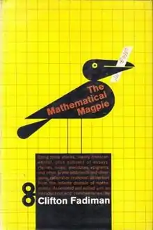 The Mathematical Magpie is an anthology published in 1962, compiled by Clifton Fadiman as a companion volume to his Fantasia Mathematica (1958).[1] The volume contains stories, cartoons, essays, rhymes, music, anecdotes, aphorisms, and other oddments. Authors include Arthur C. Clarke, Isaac Asimov, Mark Twain, Lewis Carroll, and many other renowned figures. A revised edition was issued in 1981 and again in 1997. Although out of print, it is recommended for undergraduate mathematics libraries by the Mathematical Association of America as part of their Basic Library List.[2]