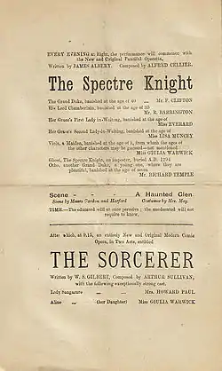 The Spectre Knight is a one-act "fanciful operetta" with a libretto by James Albery and music by Alfred Cellier. It was first performed on 9 February 1878 at the Opera Comique by the Comedy Opera Company as a companion piece to The Sorcerer. The piece continued to run until 23 March 1878 and was revived by the company from 28 May 1878 to 10 August 1878 as a companion piece to H.M.S. Pinafore. The piece had a run in New York in 1880 and was toured in Britain and America.[1]