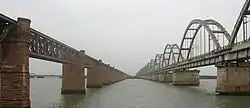 Tied arch bridges may consist of successively lined up tied arches in places where a single span is not sufficient. An example for this is the Godavari Arch Bridge in Rajahmundry, India. It has four separate supports on each pier and carries the South Central Railway Line of India. It was designed for 250 km/h rail services.
