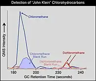 On December 3, 2012, NASA reported that Curiosity performed its first extensive soil analysis, revealing the presence of water molecules, sulfur and chlorine in the Martian soil.[79][80] The presence of perchlorates in the sample seems highly likely. The presence of sulfate and sulfide is also likely because sulfur dioxide and hydrogen sulfide were detected. Small amounts of chloromethane, dichloromethane and trichloromethane were detected. The source of the carbon in these molecules is unclear. Possible sources include contamination of the instrument, organics in the sample and inorganic carbonates.[79][80]