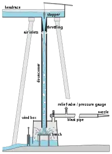 Trompes were used to provide compressed air for bloomery furnaces in Catalonia[1] and the USA.[2] The presence of a trompe is a signature attribute of a Catalan forge, a type of bloomery furnace.