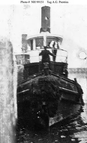 The United States Navy inspected her in the 3rd Naval District on 6 March 1918, and selected her for service. A. G. Prentiss was delivered to the Navy on 25 March 1918, under a charter approved three days later.[5][6] Navy references do not indicate commissioning and thus the ship did not bear the United States Ship (U.S.S.) honorific.[5][6]