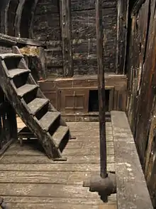 In a typical arrangement, an iron gooseneck was fitted at the fore end of the tiller. Then, a metal ring was fitted over this and secured with a pin. The ring was attached to a long, thin pole (the whipstaff proper) and this pole connected the tiller to the helmsman one or more decks above it through a pivot point, roll, or rowle, described as "that round piece of wood or iron wherein the whip doth go and is made turn about that it may carry over the whip from side to side with more ease."[2]: p.173 The helmsman himself still usually did not stand on the topmost deck, but rather viewed what lay ahead of the ship through a small port or hatchway in the deck above him called a companion. To move the ship to port, the forward-facing helmsman pulled the top of the staff to his left and pushed the pole down and to the right; to move it to starboard, he pulled the top to his right and pushed the pole down and to the left. In this fashion, the tiller might get as much as 20° of turn[3] though angles of between 5° and 10° seem more likely.[4] The tiller rested on a very strong horizontal wooden bar called the tiller sweep, which was sheathed in metal and coated with soap and grease to minimize the drag of the tiller as it rode across it.