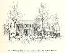 The initial engagement on July 21, 1861, of what would become the First Battle of Bull Run (First Manassas) took place on McLean's farm, the Yorkshire Plantation, in Manassas, Prince William County, Virginia. Union Army artillery fired at McLean's house, which was being used as a headquarters for Confederate Brigadier General P. G. T. Beauregard, and a cannonball dropped through the kitchen fireplace. Beauregard wrote after the battle, "A comical effect of this artillery fight was the destruction of the dinner of myself and staff by a Federal shell that fell into the fire-place of my headquarters at the McLean House."[1]