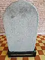 The 1413 stele was erected at Yongning Temple to commemorate its construction by Yishiha. The stele is 179 × 83 × 42 cm in dimensions,[4] and is inscribed on the front with an inscription in Chinese which extols the Yongle Emperor and recounts Yishiha's expedition. On the back of the stele are abbreviated versions of the Chinese inscription written in Mongolian and Jurchen. On one side of the stele, the Buddhist mantra Om mani padme hum is engraved vertically in four different scripts:[4][5]